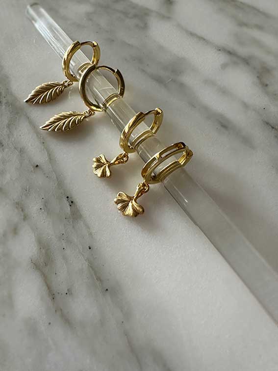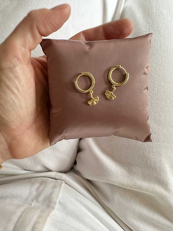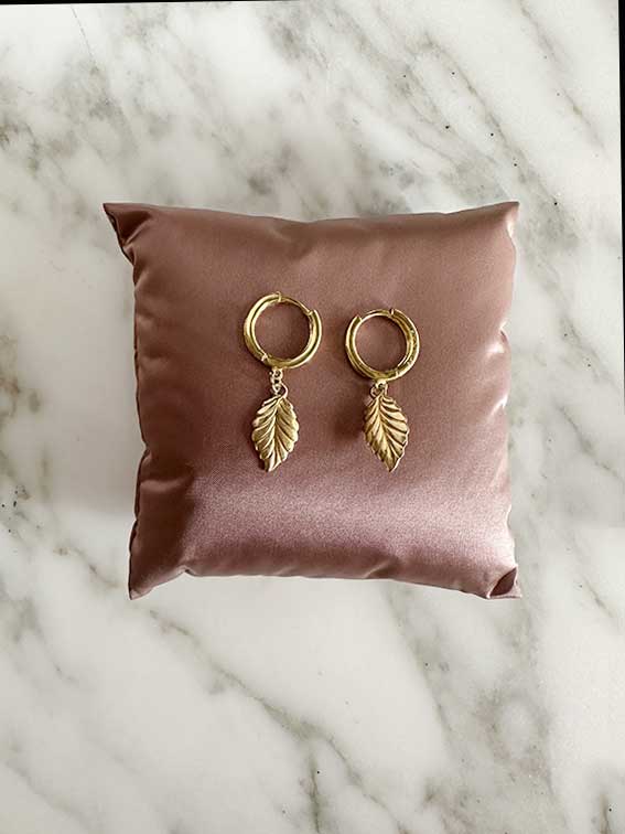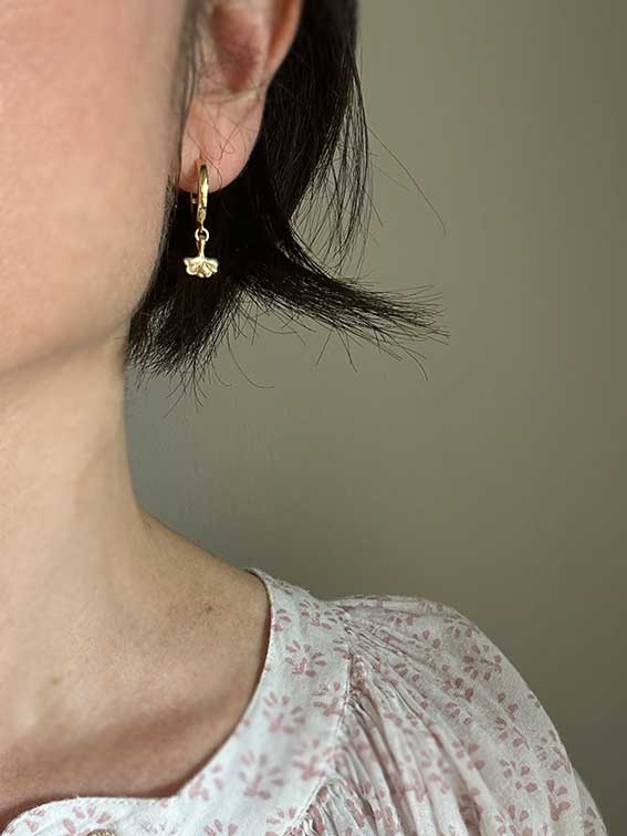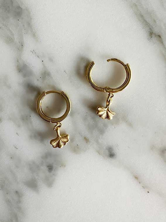 Graziosi orecchini composti da un cerchietto con chiusura a scatto e una foglia pendente. Scegli tra il gingko biloba, simbolo di resilienza e la fogliolina classica, simbolo di rinnovamento.