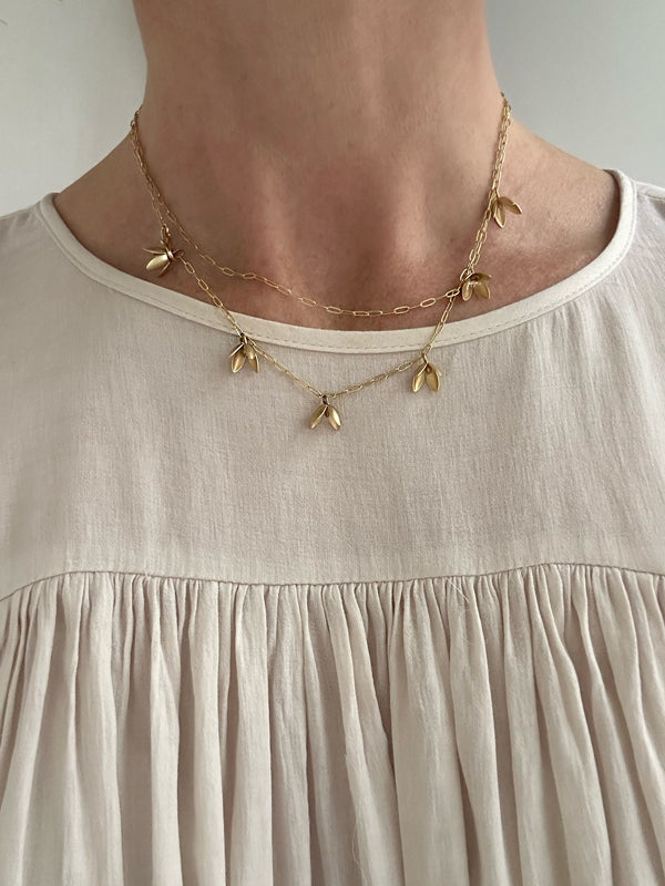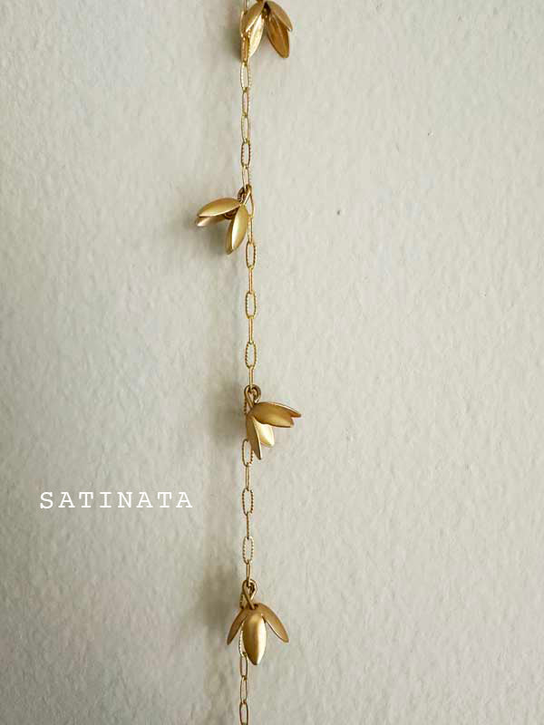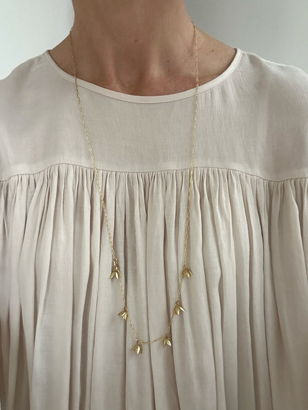 A delicate and romantic necklace that will envelop you in poetry thanks to small golden snowdrops. Unexpected beauty, where you least expect it. Satin-finished 18kt gold-plated silver chain, nickel-free. Brass snowdrops. Necklace length: 80 cm