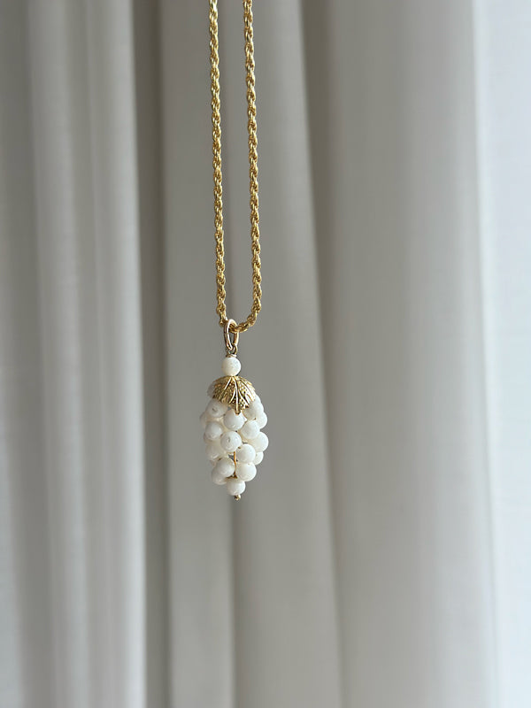 Necklace with a retro feel, composed of a rope chain with a pendant with a bunch of grapes made from real coral pearls. Necklace length: 50cm