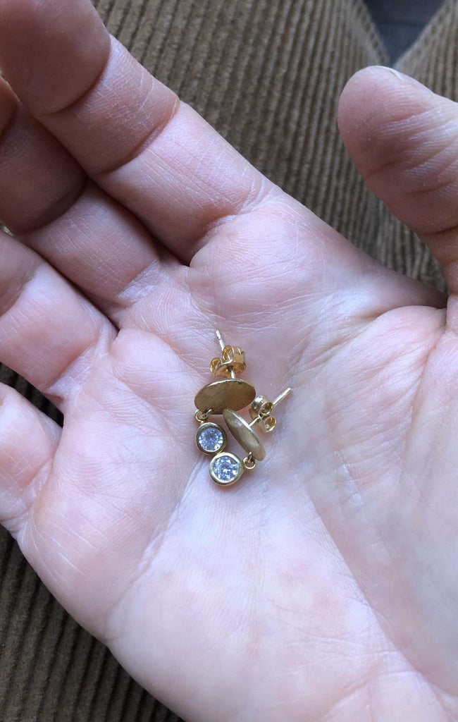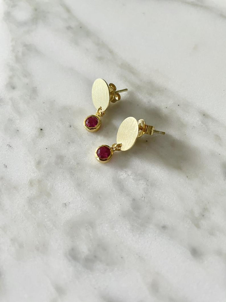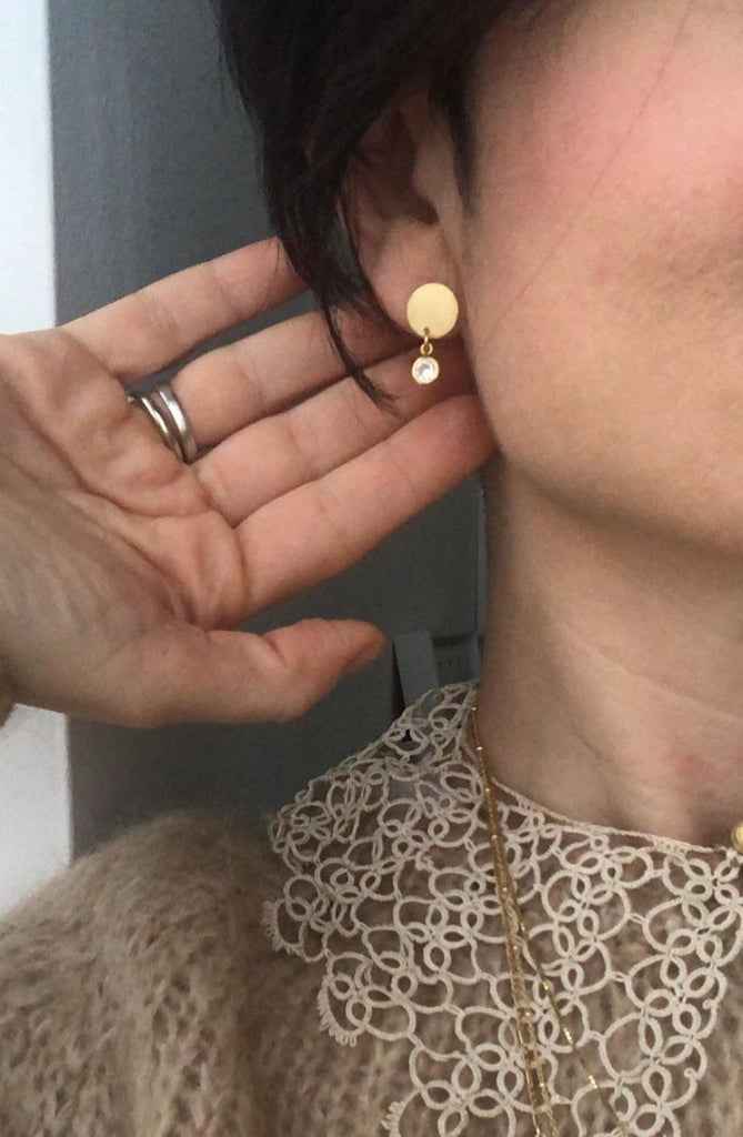 Delicious earrings composed of a screw closure with a satin medal and a small zircon. Elegant and perfect every day. In 18 kt gold plated silver.