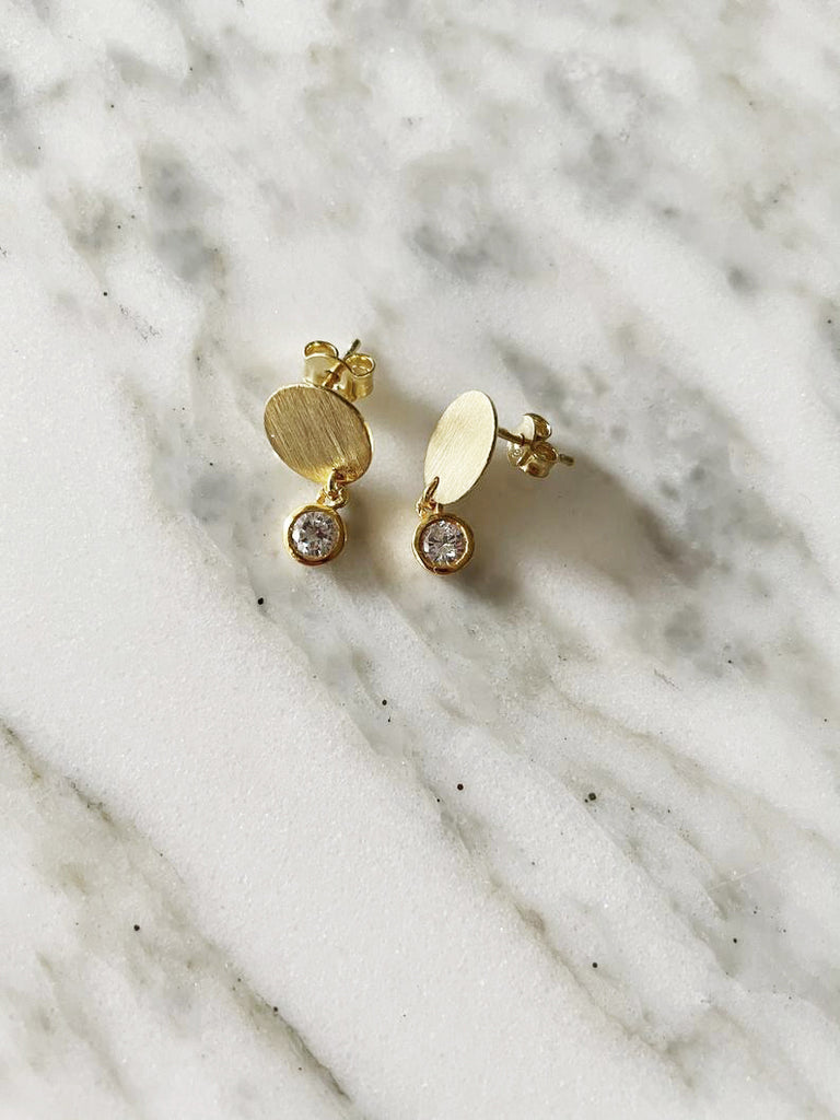 Deliziosi orecchini composti da una chiusura a vite con medaglietta satinata e un piccolo zircone. Eleganti e perfetti ogni giorno. In argento placcato oro 18 kt.