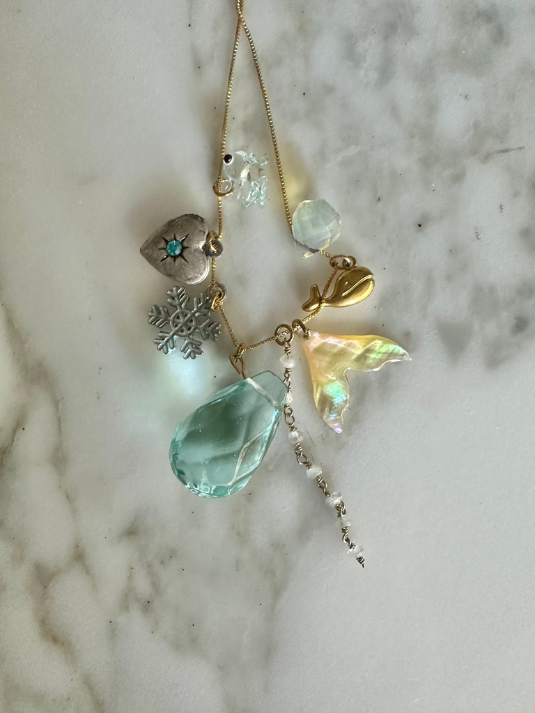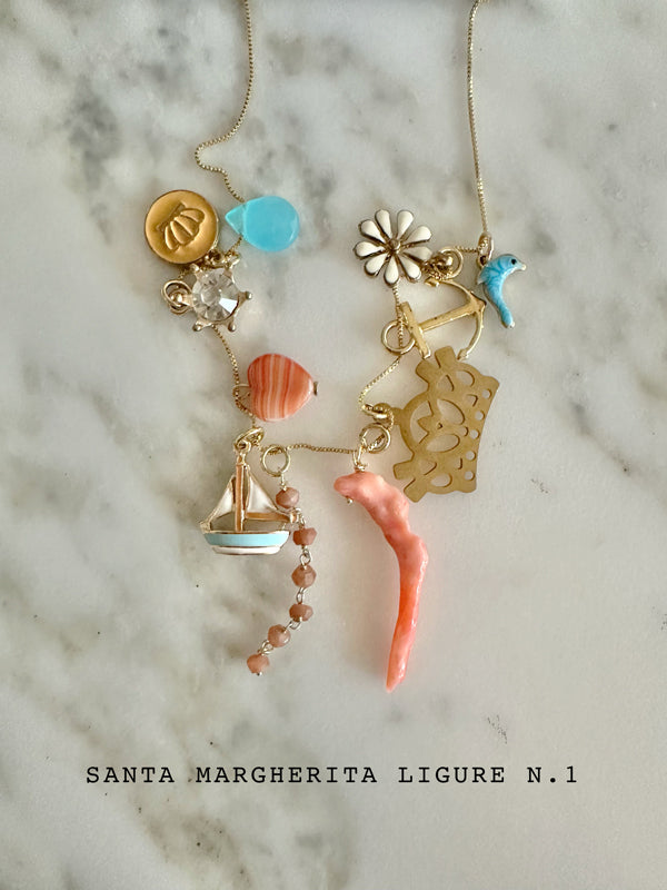 They are composed of an 18 kt gold plated 925 silver chain and pendants of different materials that evoke places and typical sensations of a place.