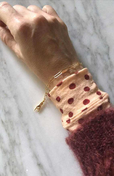Bracelet made by a rectangular link chain and a pendant in the shape of a hand that makes the horns, which in the Italian tradition is considered a very strong amulet against bad luck. To give as a gift or treat yourself, it goes perfectly with other bracelets or the watch. 18kt gold plated 925 silver. The bracelet is 18 cm long. It is possible to make it to measure.
