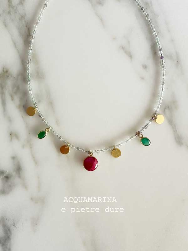 Collane gipsy chic, composte da un filo di pietre dure più piccoli charms, pietre o medagliette in argento 925 placcato oro 18 kt.