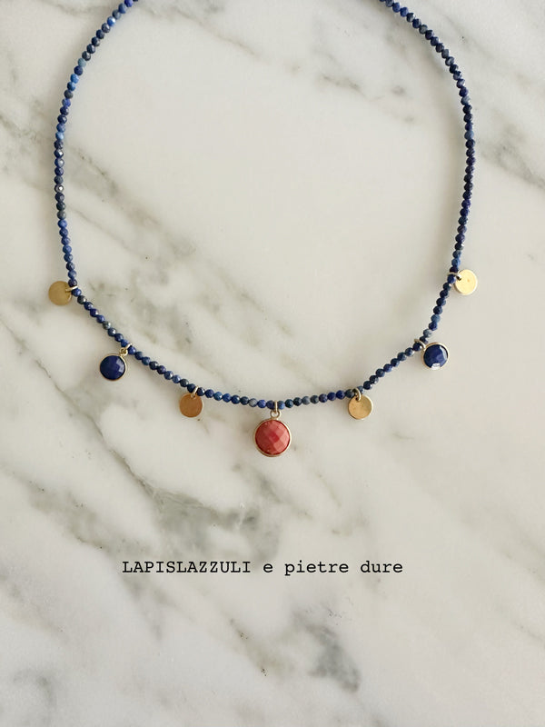 Collane gipsy chic, composte da un filo di pietre dure più piccoli charms, pietre o medagliette in argento 925 placcato oro 18 kt.
