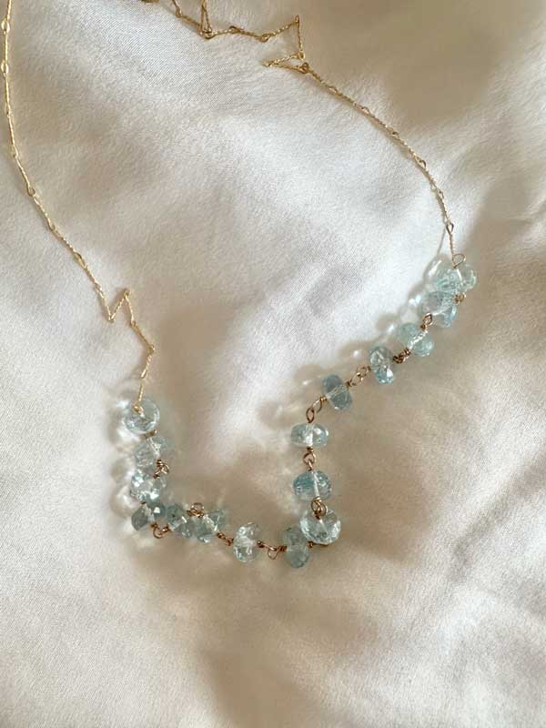 Incredibili rondelle in bellissima pietra di acquamarina con catenina sottile in argento placcato oro. Un colore trasparente che le fa assomigliare a delle piccole meduse.
