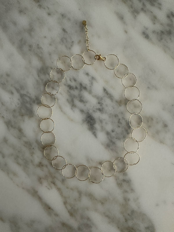 A chain that binds those who give and those who receive. A series of perfect circles linked between them, to be fastened as you prefer. Minimal and elegant. In 18kt gold plated silver.