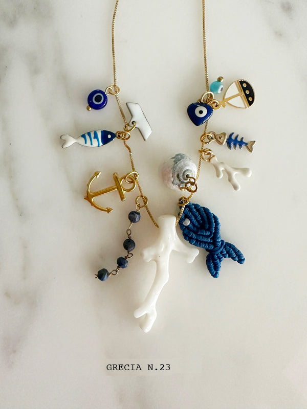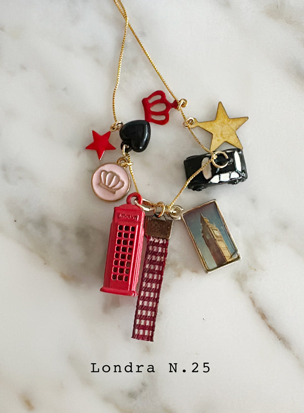 Sono composti da una catenina in argento 925 placcato oro 18 kt e ciondoli di diverso materiale che evocano luoghi e sensazioni tipiche di un posto.