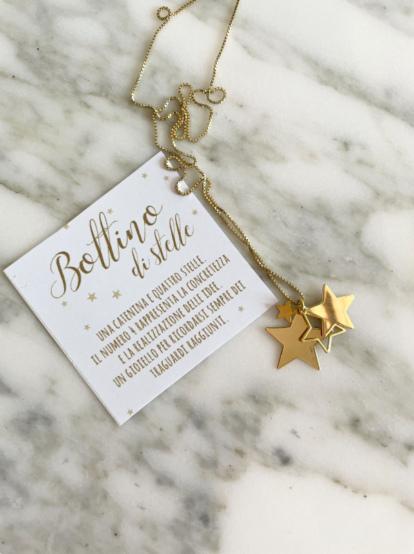 BOTTINO DI STELLE: the concept of this necklace is about a jewel to give or to treat yourself to, to fill up with stars, as a symbol of protection and good wishes. A Venetian chain and 4 star-shaped pendants of different sizes and designs. Necklace length: 70 cm, completely in 18kt gold plated silver The number 4 represents the concreteness and the realization of ideas but everyone can give this necklace the meaning they want. 4 children, 4 years of friendship, 4 partners .... Choose between white or gold finish.