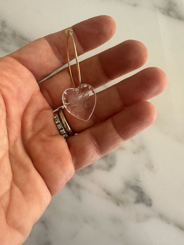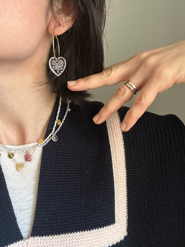 Limited Edition A piece of jewelry that celebrates love by speaking about TRUST, a fundamental prerequisite for love and friendship. A SINCERE heart, made of vintage glass, and an 18kt gold-plated silver hoop. Hoop diameter: 3 cm, heart length: 2 cm