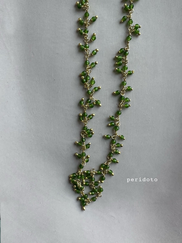A chocker made like a branch of bunches full of and small berries. Feminine and delicate. Handmade rosary with clusters of semi-precious stones. Length: 38 cm, 18kt gold plated silver.