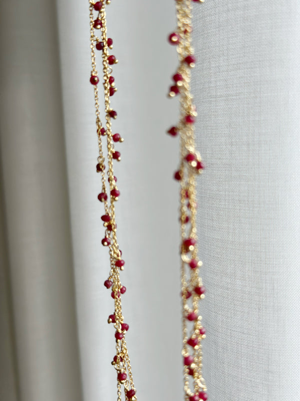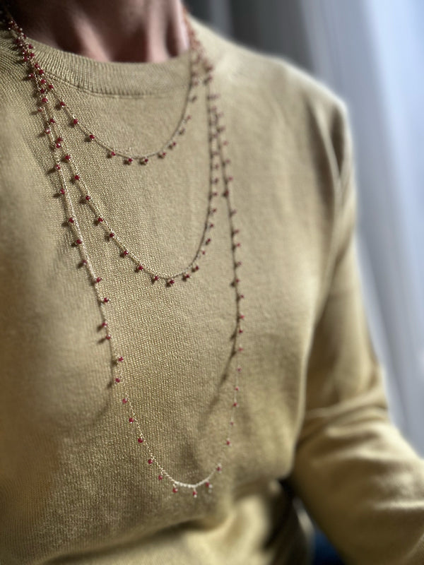 Una bellissima collana composta da 3 fili in argento placcato oro e piccole pietrine di granato.