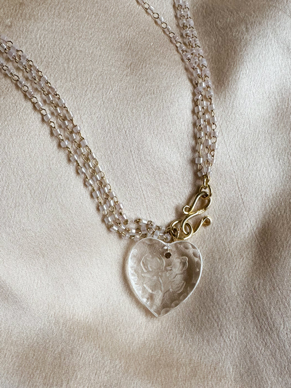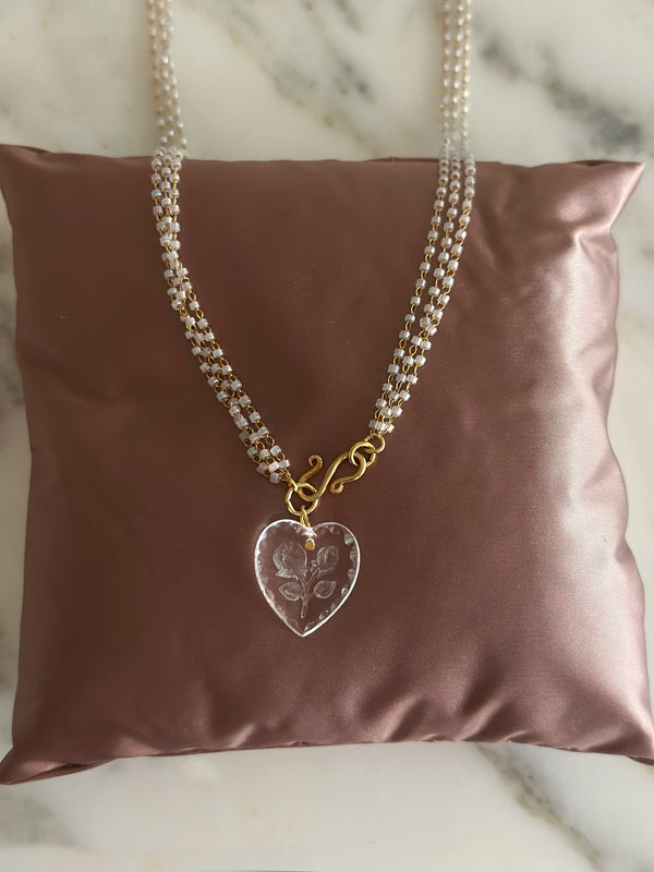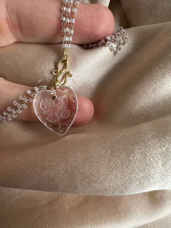 Limited Edition A piece of jewelry that celebrates love by speaking about TRUST, a fundamental prerequisite for love and friendship. A SINCERE heart, made of vintage glass and strands of small glass beads. Choker length: 45 cm Hook clasp, in 18kt