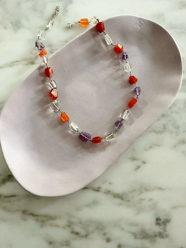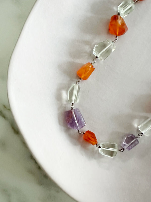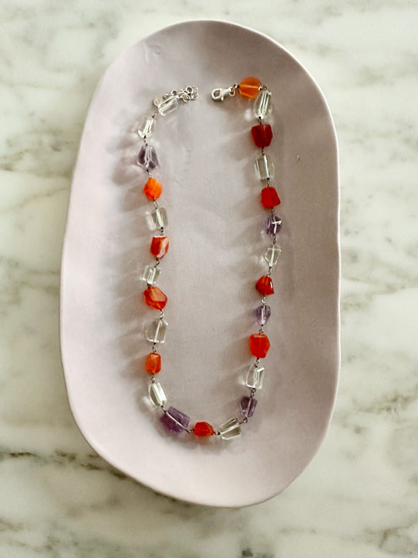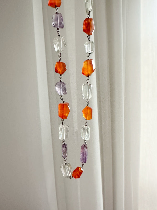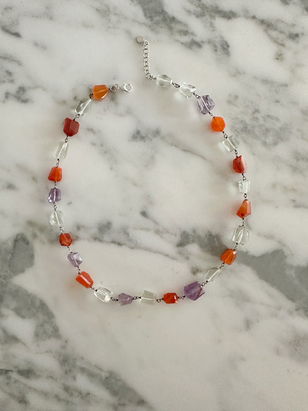 LIMITED EDITION Beautiful carnelian, purple amethyst, and light green amethyst stones, set in a rosary, alternate to create a truly stunning necklace. Rosary base in white silver. Necklace length: 38 cm, extendable to 40 cm