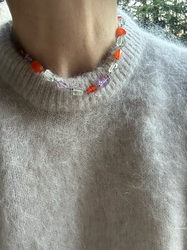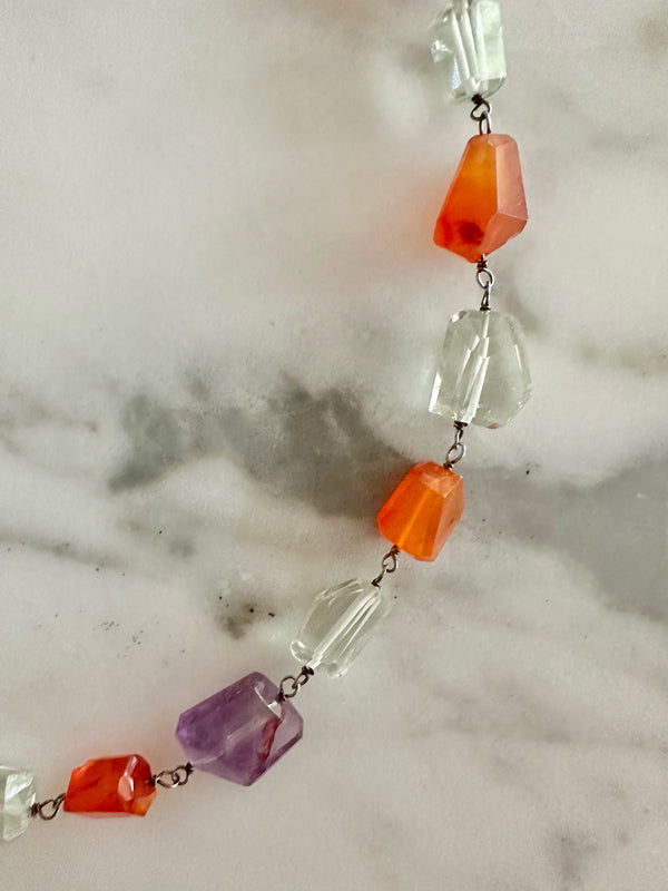 Bellissime pietre di corniola, ametista viola e ametista verde chiaro, montate a rosario, si alternano per creare un girocollo davvero meraviglioso.