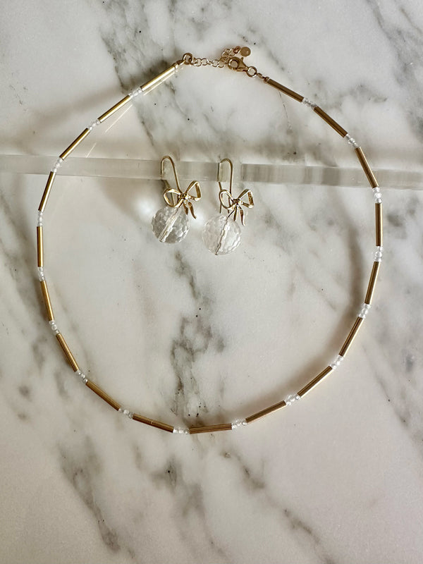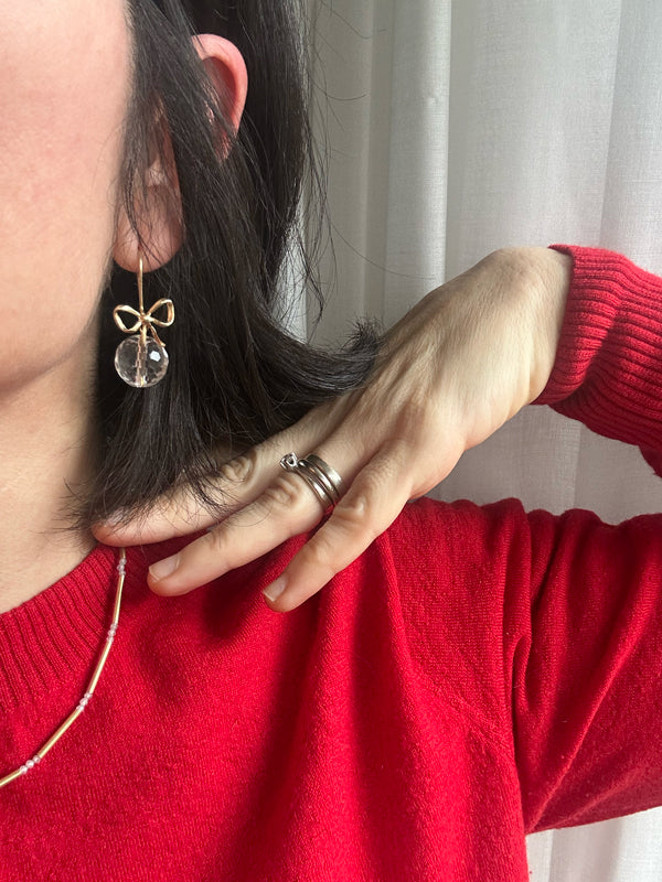 Una perla di cristallo di rocca e una monachella con fiocchetto dorato. Preziosi e luminosi, doneranno un tocco di luce al tuo viso.